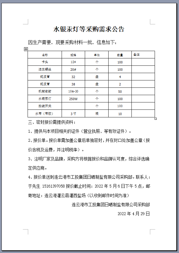 水銀汞燈等采購需求公告